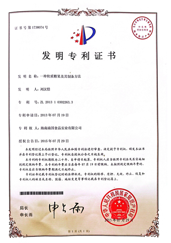 软质糖及造备步骤专利证书