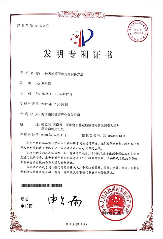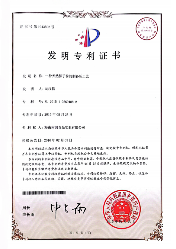 天然椰子粉的造备新工艺专利证书