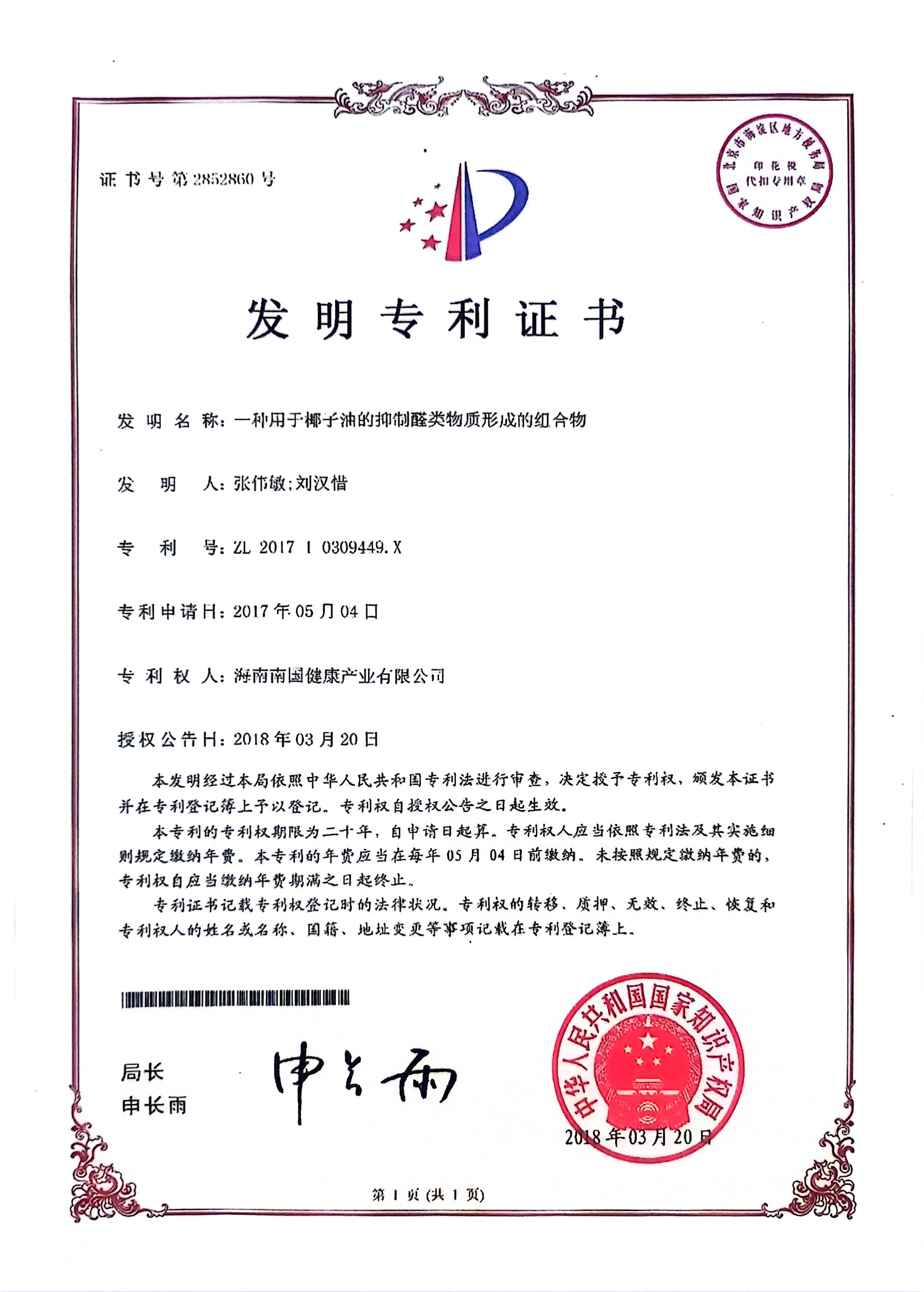 椰子油抑造醛类物质形成专利证书